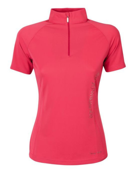 Shirt met opstaande kraag afgerond naar de korte ritssluiting aan de voorkant, een sportieve band met logo aan de zijkanten en een logo op de borst.