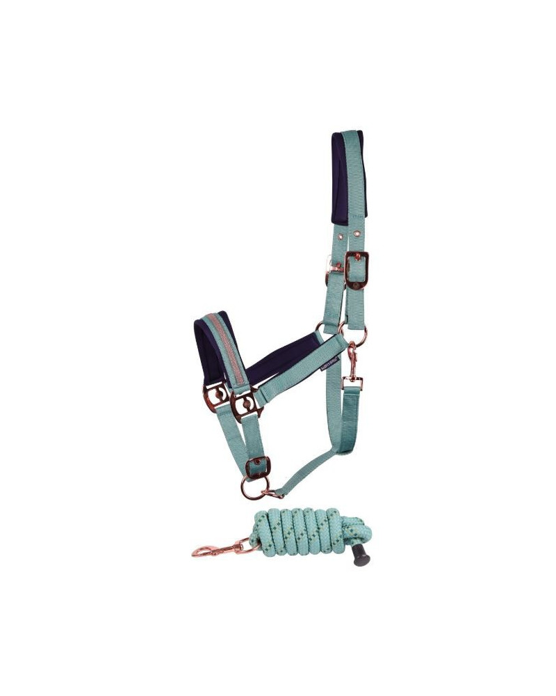 Eenvoudig, zacht halster met glanzende details en traploos verstelbaar kopstuk.