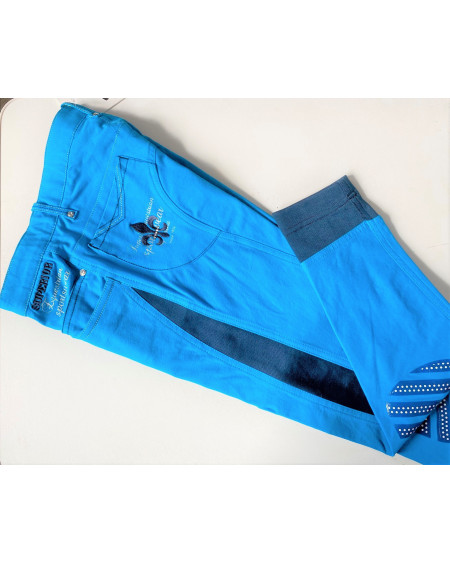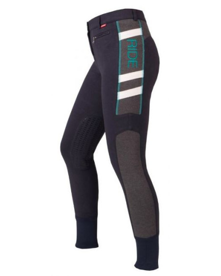 Imperial Riding rijbroek met steekzakken voor en achter voorzien van luxe zilverkleurig borduursel en bling. Elastische inzetstukken onderaan. Dubbele haaksluiting. Grijs kunstleren zitvlak.