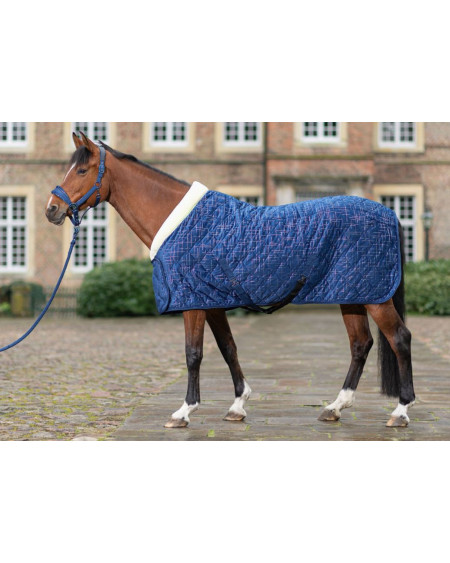 Fleece deken van een zachte coral fleece met 3-kleurige bies, kruissingels, twee voorsluitingen en een staartlus.